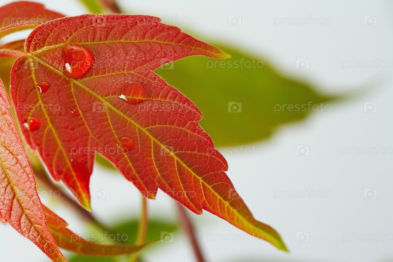 Капля росы на красном листе крупным планом