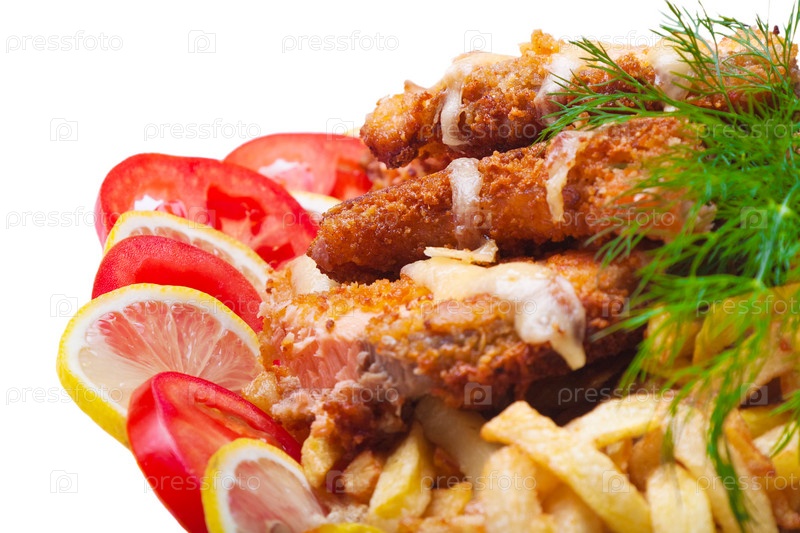 Рыба, обжаренная в сухарях с помидорами и лимоном, на белом фоне