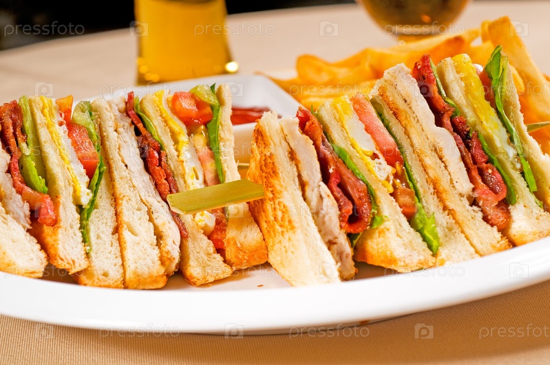 Свежие тройные клубные бутерброды с картофелем фри