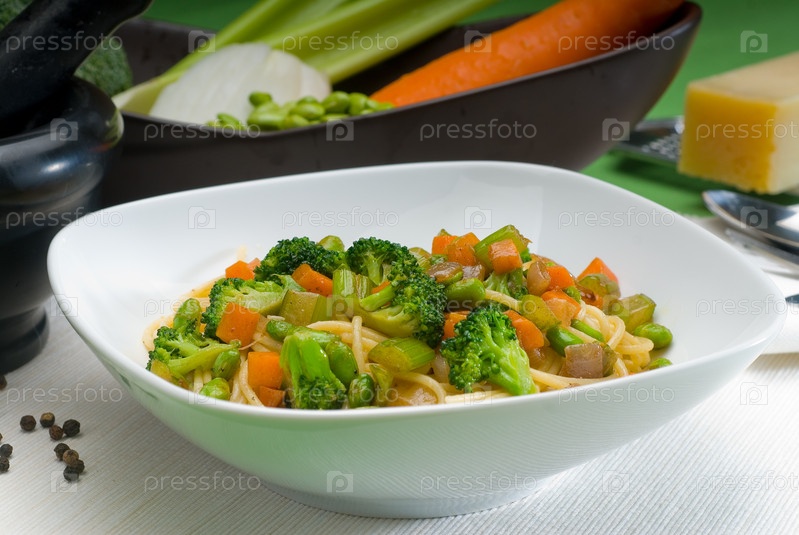 Итальянские спагетти со свежими овощами и домашним соусом