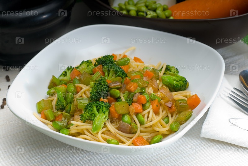 Итальянские спагетти со свежими овощами и домашним соусом