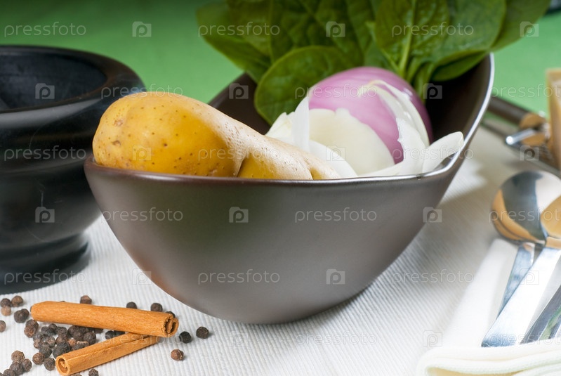 Ингредиенты для супа. Свежие овощи в чашке и специи рядом