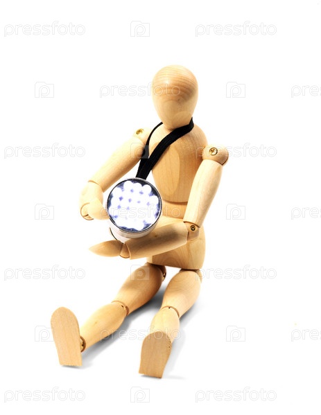 Деревянный человечек с фонариком на белом фоне