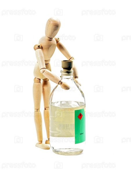Деревянный человечек с бутылкой легковоспламеняющейся жидкости на белом фоне