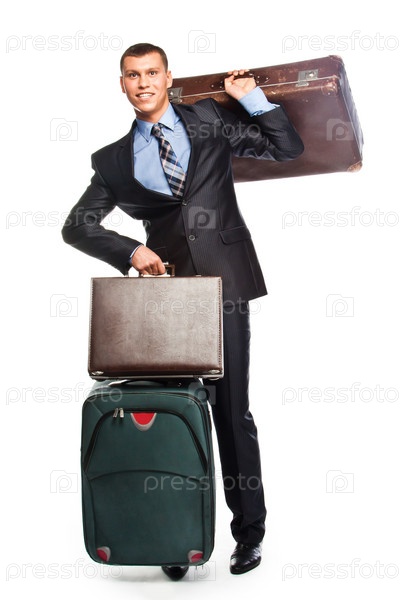 Молодой успешный бизнесмен в деловом костюме и с тремя чемоданами отправляется в путешествие