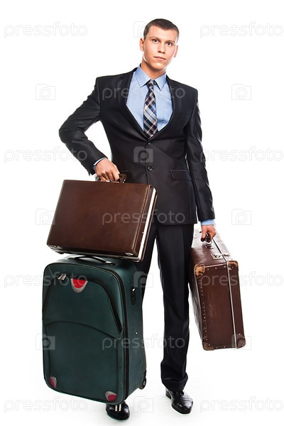 Молодой успешный бизнесмен в деловом костюме и с тремя чемоданами отправляется в путешествие