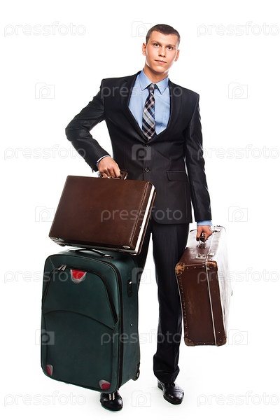Молодой успешный бизнесмен в деловом костюме и с тремя чемоданами отправляется в путешествие