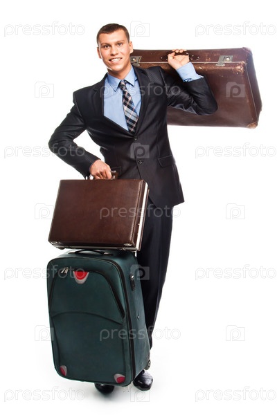 Молодой успешный бизнесмен в деловом костюме и с тремя чемоданами отправляется в путешествие