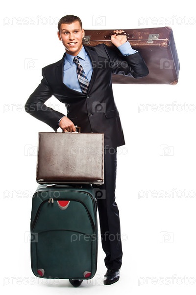 Молодой успешный бизнесмен в деловом костюме и с тремя чемоданами отправляется в путешествие
