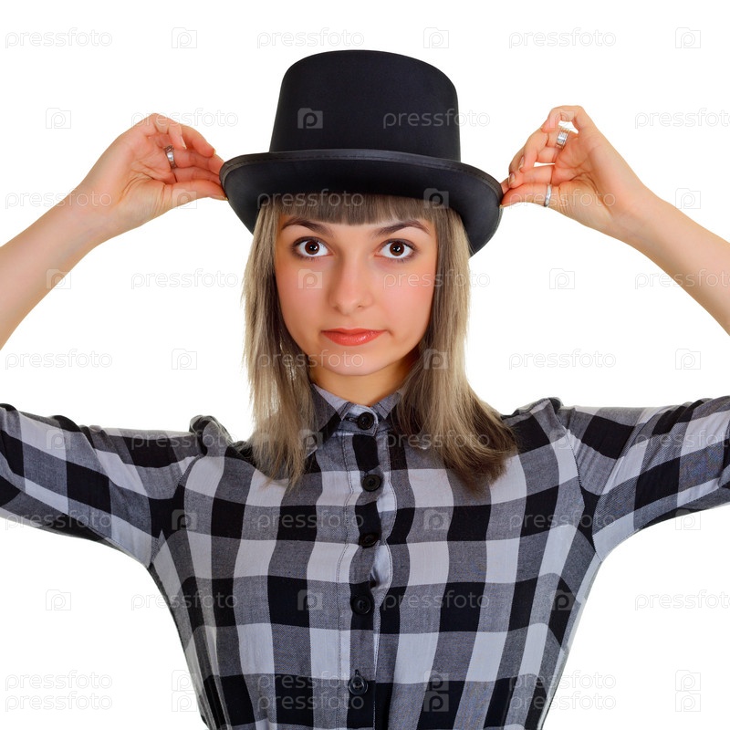 Девушка в черной шляпе на белом фоне