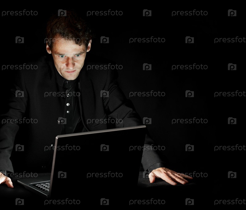 Хакер с ноутбуком в темной комнате