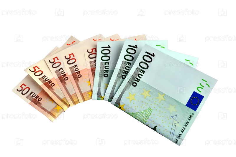 Банкноты достоинством 50 и 100 евро крупным планом на белом фоне