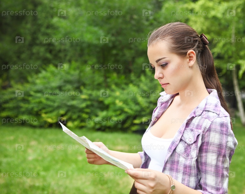 Молодая брюнетка держит карту в сельской местности