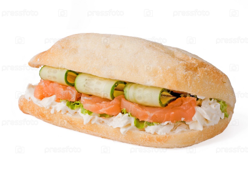 Сэндвич с огурцом и лососем, изолированный на белом фоне
