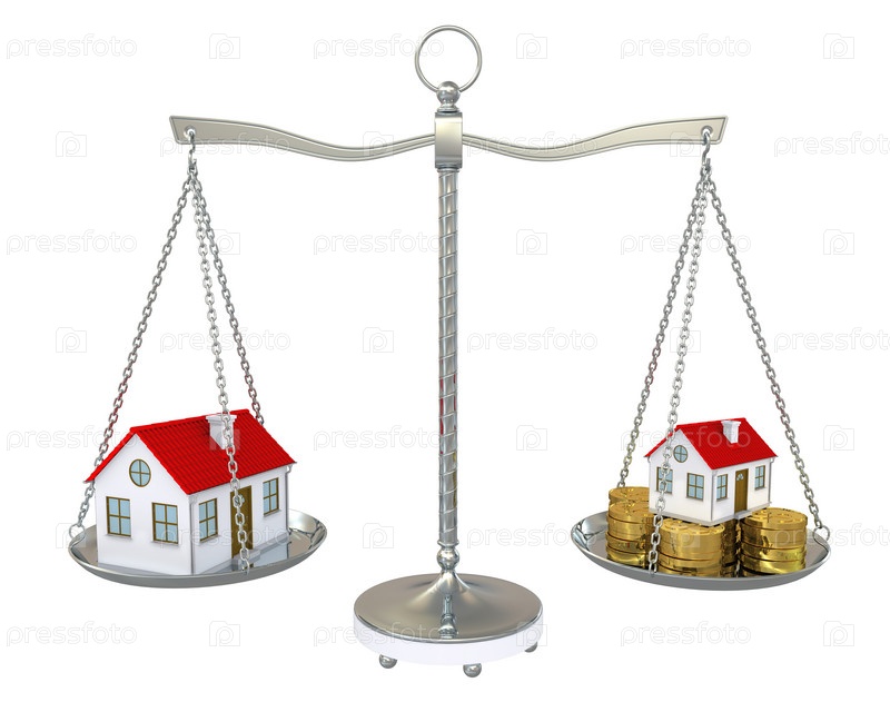 Дом и маленький домик с монетами на весах на белом фоне