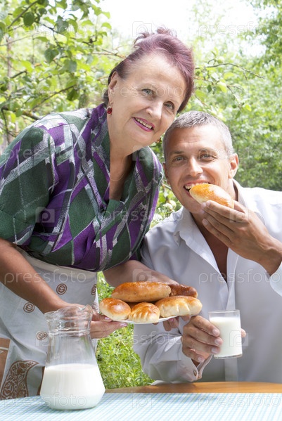 Счастливая семья ест аппетитные печеные пироги с свежим молоком в летнем саду
