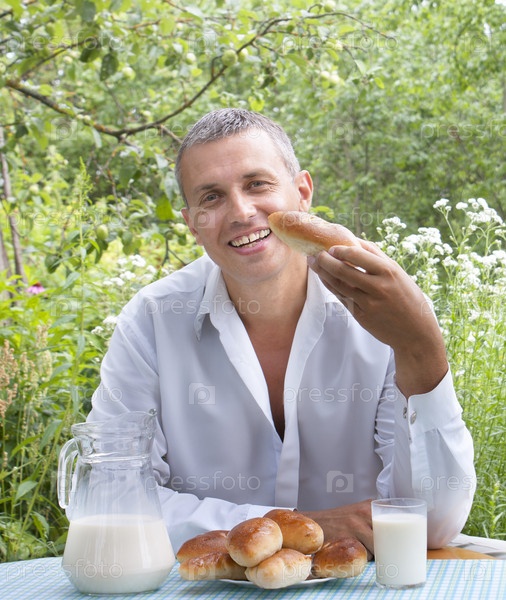 Счастливый улыбающийся мужчина и румяные домашние пирожки с парным молоком в летнем саду