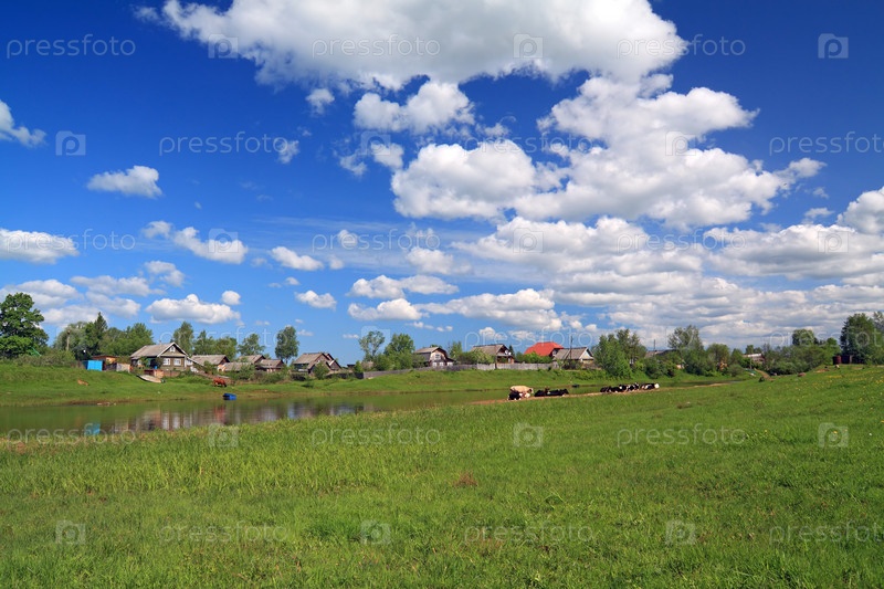 Коровы на берегу реки рядом с деревней