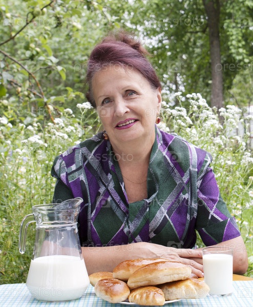 Счастливая улыбающаяся женщина пьет парное молоко с румяными домашними пирожками