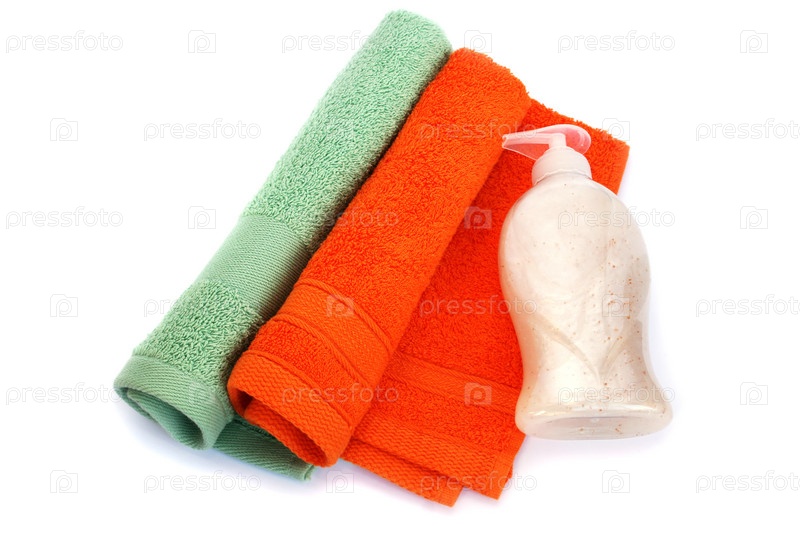 Цветные полотенца и бутылка жидкого мыла