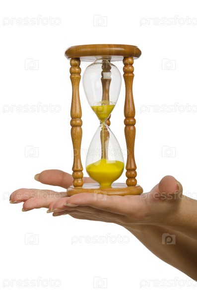 Руку с песочными часами на белом фоне