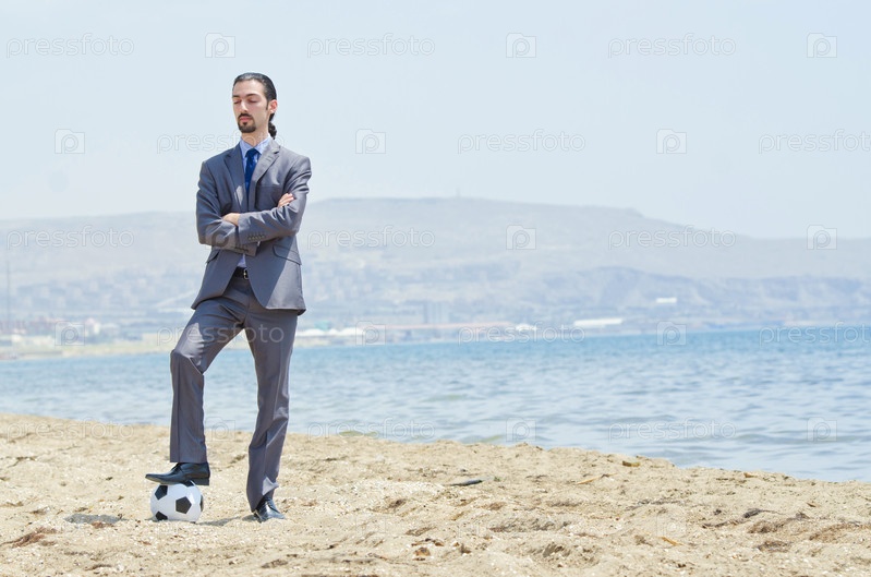 Бизнесмен с футбольным мячом на пляже