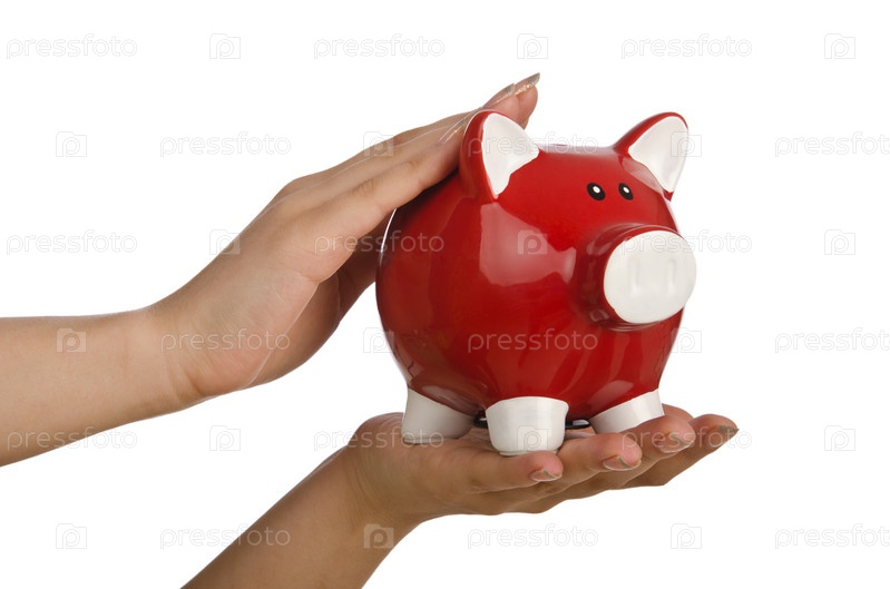 Копилка в женских руках на белом фоне