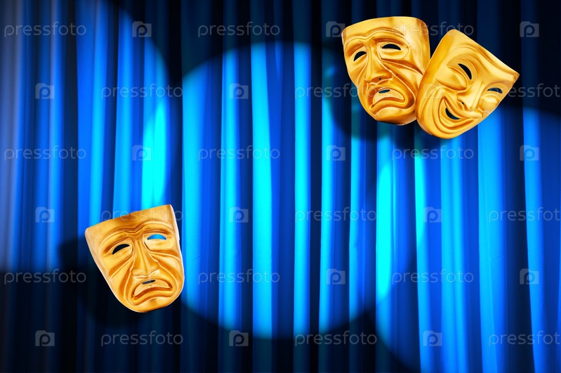 Театральные маски на фоне занавеса