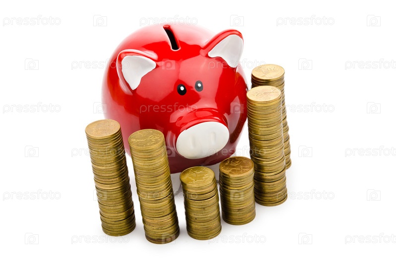 Копилка и монеты на белом фоне