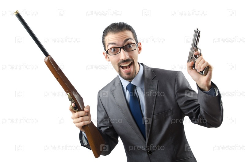 Бизнесмен с ружьем и пистолетом на белом фоне