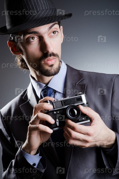 Фотограф в шляпе на сером фоне