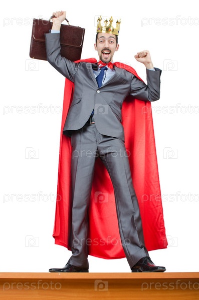 Бизнесмен в костюме короля стоит на столе
