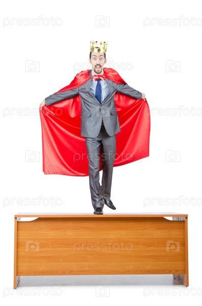 Бизнесмен в костюме короля стоит на столе