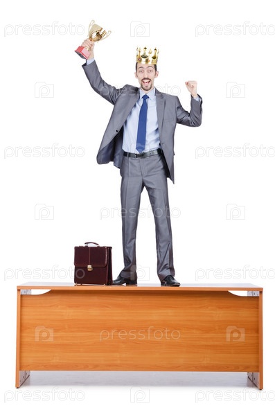 Бизнесмен с кубком в руке стоит на столе