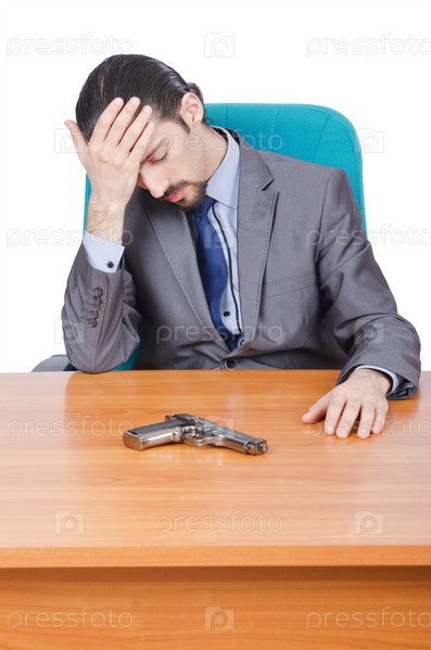 Бизнесмен с пистолетом сидит за столом
