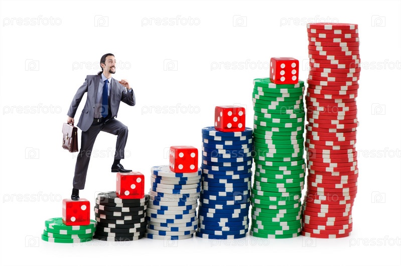 Бизнесмен поднимается по стопкам фишек из казино