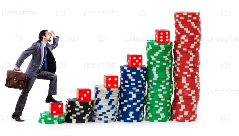 Бизнесмен поднимается по стопкам фишек из казино