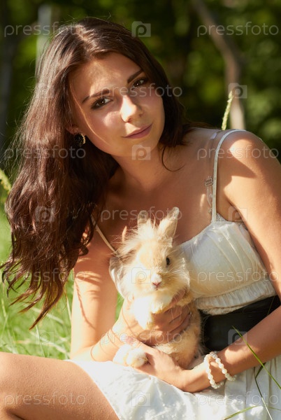 Девушка с кроликом в руках на свежем воздухе