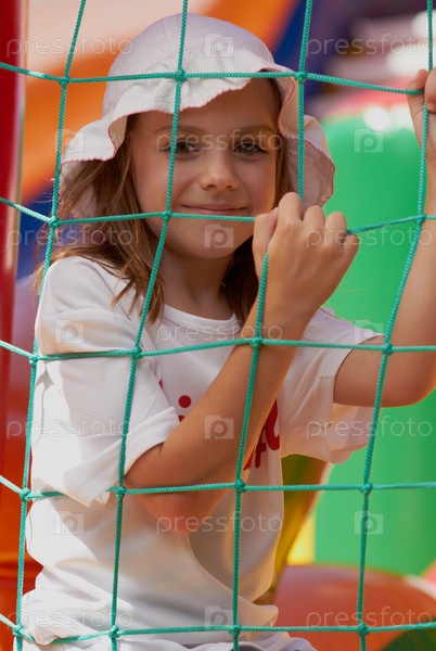 Хорошенькая девочка в надувном замке в солнечный день