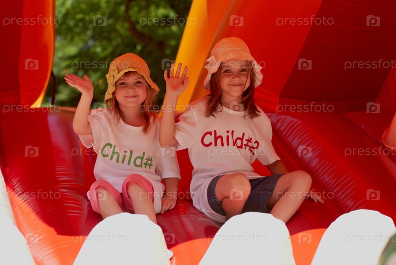 Симпатичные девочки в надувном замке в солнечный день