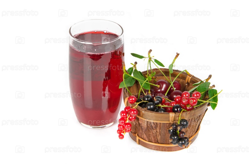Смородина, вишня и сок на белом фоне