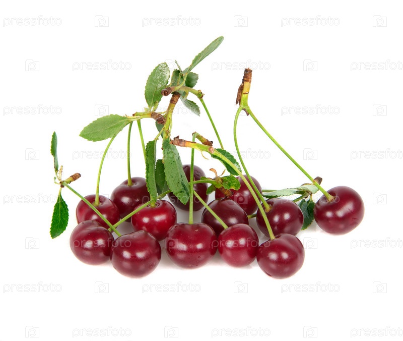Спелая вишни с листьями на белом фоне