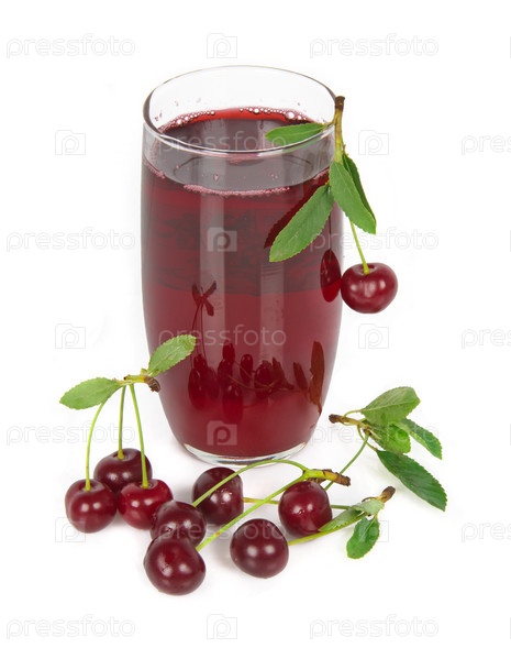 Вишня и сок на белом фоне