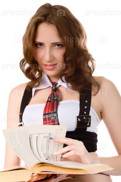 Портрет красивой девушки с книгой в руках на белом фоне