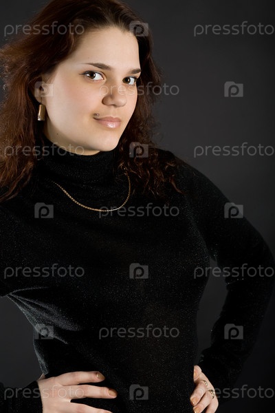 Портрет красивой девушки в черном платье на сером фоне