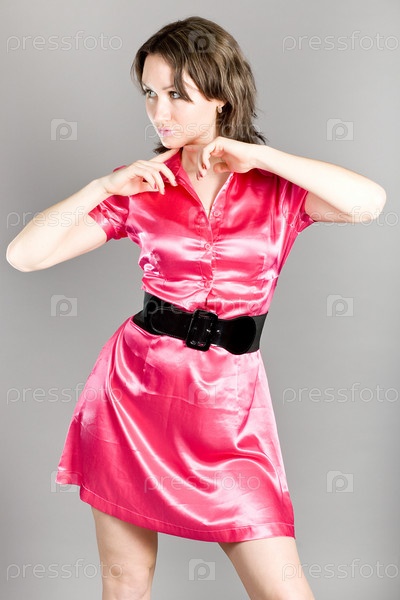 Портрет молодой красивой брюнетки на сером фоне