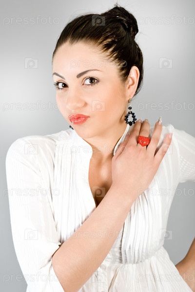 Портрет молодой красивой брюнетки на сером фоне