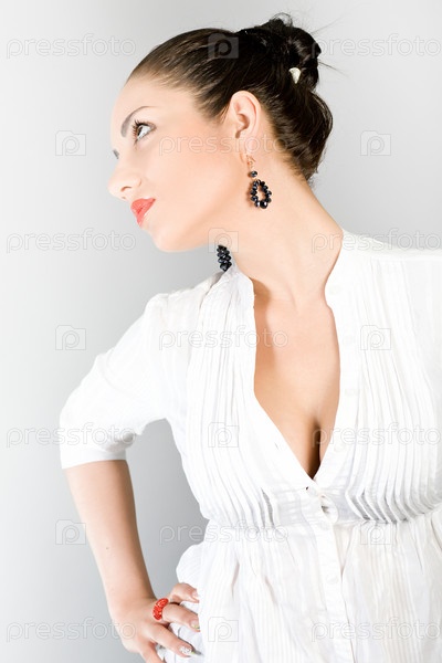 Портрет молодой красивой брюнетки на сером фоне