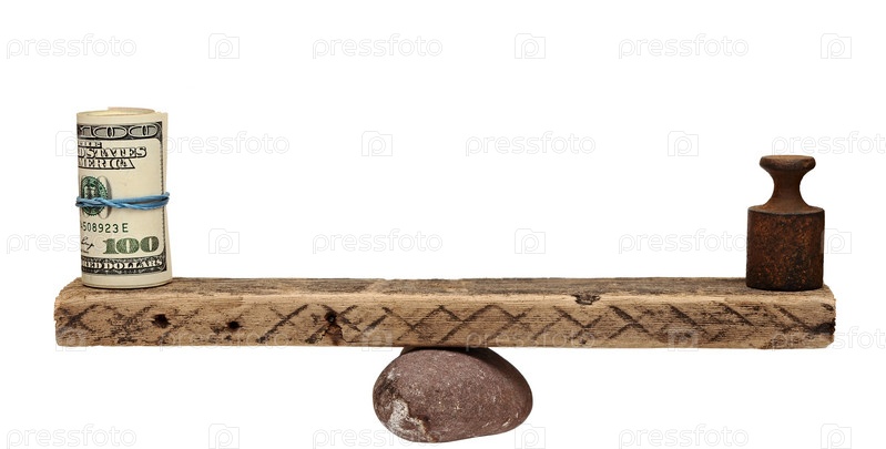 Доллары и гиря на весах на белом фоне. Время - деньги