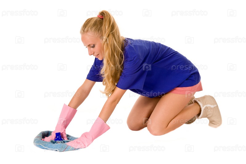 Молодая домохозяйка в резиновых перчатках моет пол